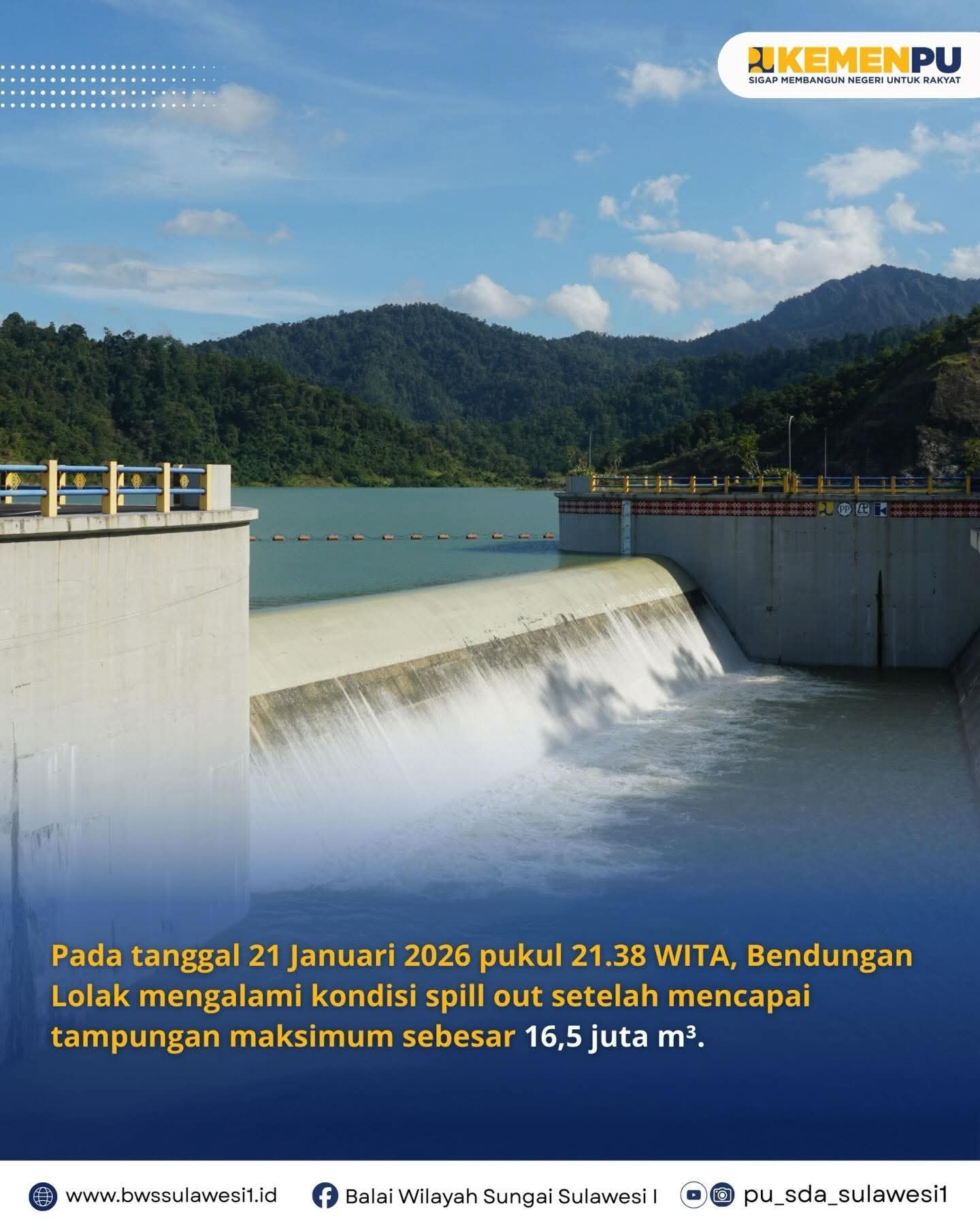 Sebelum pelaksanaan monitoring, Bendungan Lolak telah memasuki kondisi spill out pada hari sebelumnya, tepatnya 21 Januari 2026 pukul 21.38 WITA. Kondisi ini terjadi setelah volume tampungan air mencapai kapasitas maksimum sebesar 16,5 juta meter kubik, sehingga aliran masuk (inflow) melimpas melalui ambang spillway.